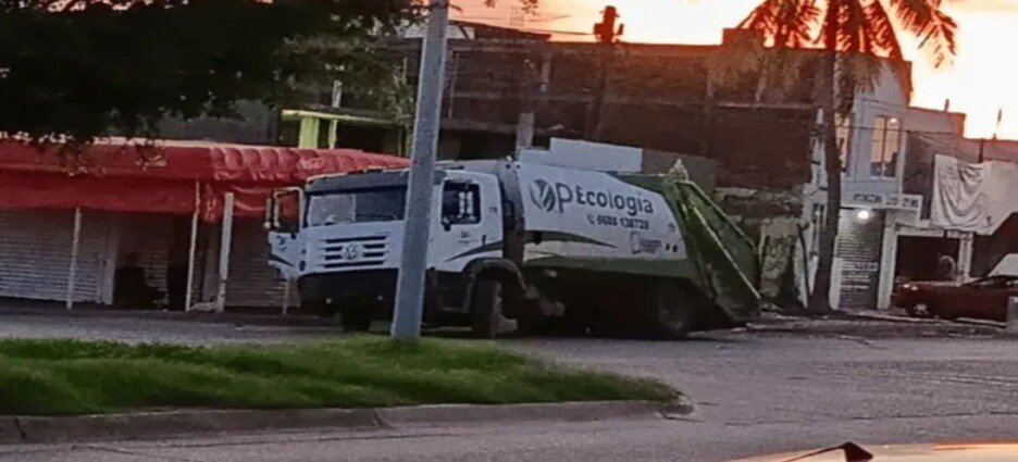 De acuerdo con testigos, el camión recolector de basura circulaba de manera habitual cuando repentinamente el pavimento cedió dejando la pesada unidad semihundida en la vialidad.